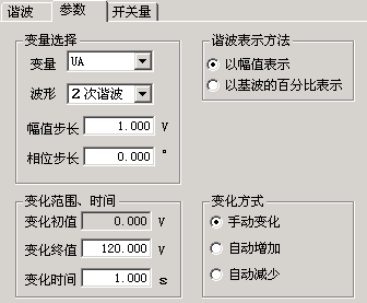 幅值步長:這里的步長也與“諧波表示方法”相對應。當選擇“以幅值表示”時,步長也以幅值表示,單位是A或V;而選擇“以基波的百分比表示”時,則步長也是百分比。