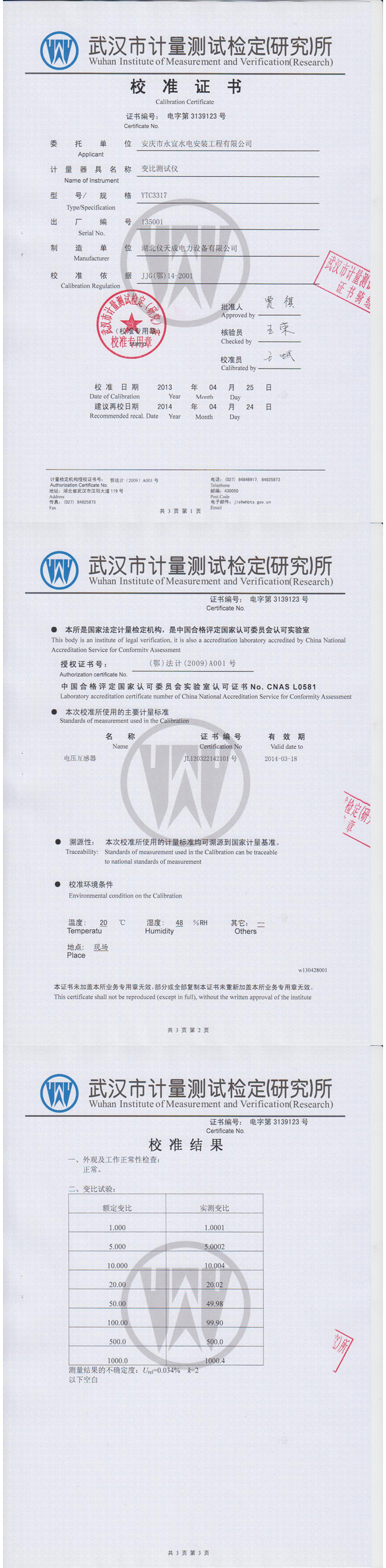 YTC3317全自動變比組別測試儀資質(zhì)證書