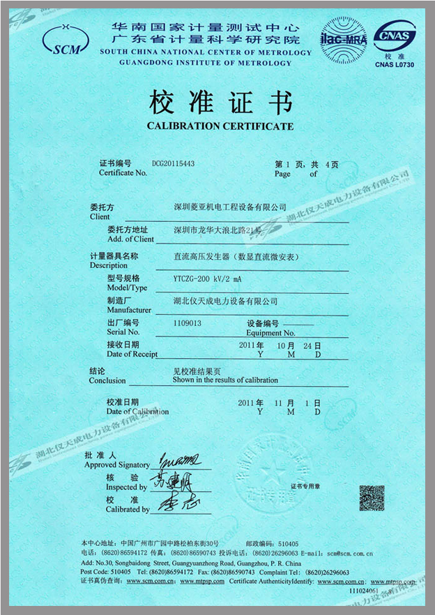 轉(zhuǎn)載:"YTCZG-200kV/2mA直流高壓發(fā)生器鑒定證書" 請注明來源于儀天成電力。 更多技術(shù)問題請致電儀天成電力客戶服務(wù):027-87876585,技術(shù)部專線:027-87876585,在線客服: